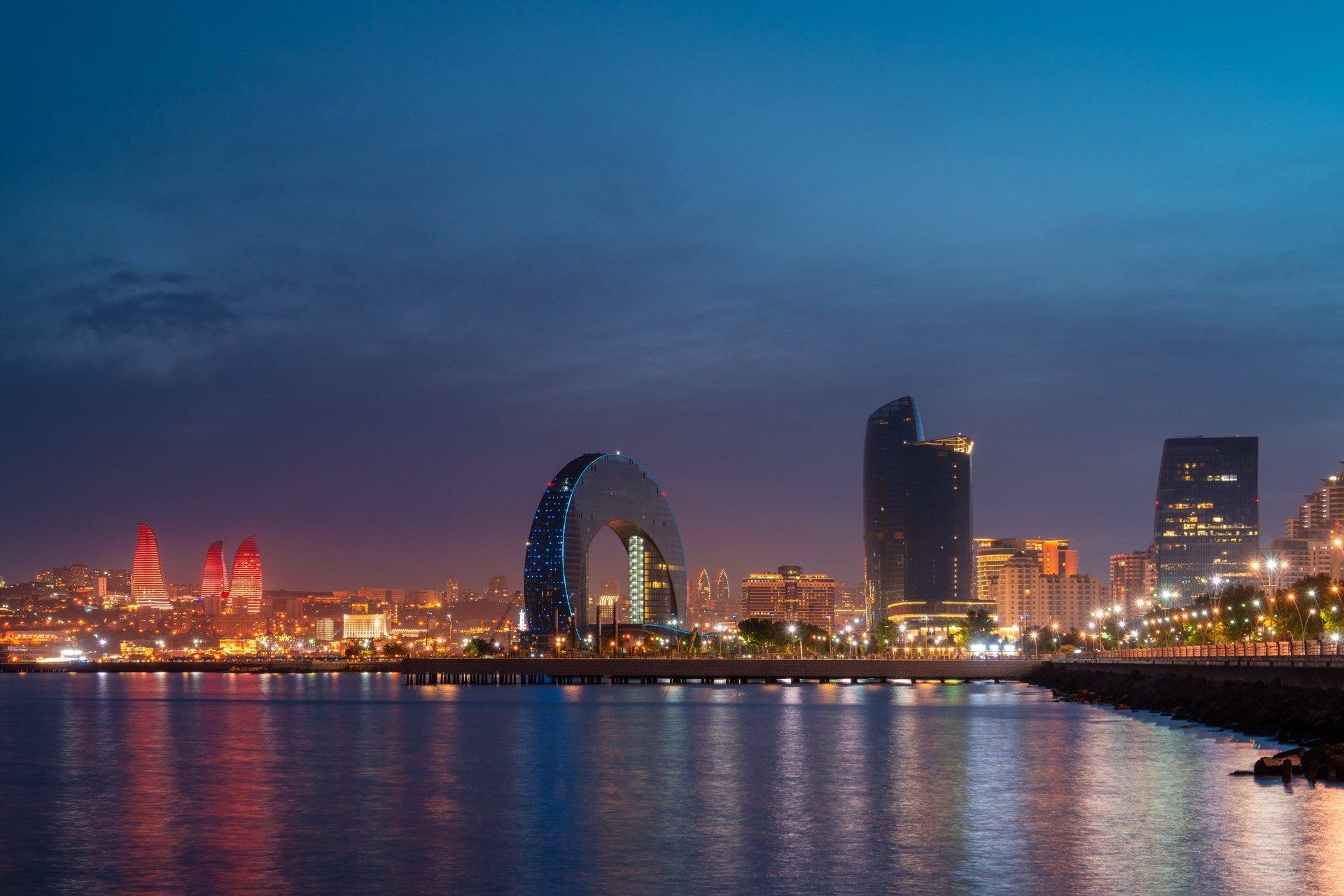 AZ1025, 8D Babek ave., Baku — architectural lighting at the Design Center.
